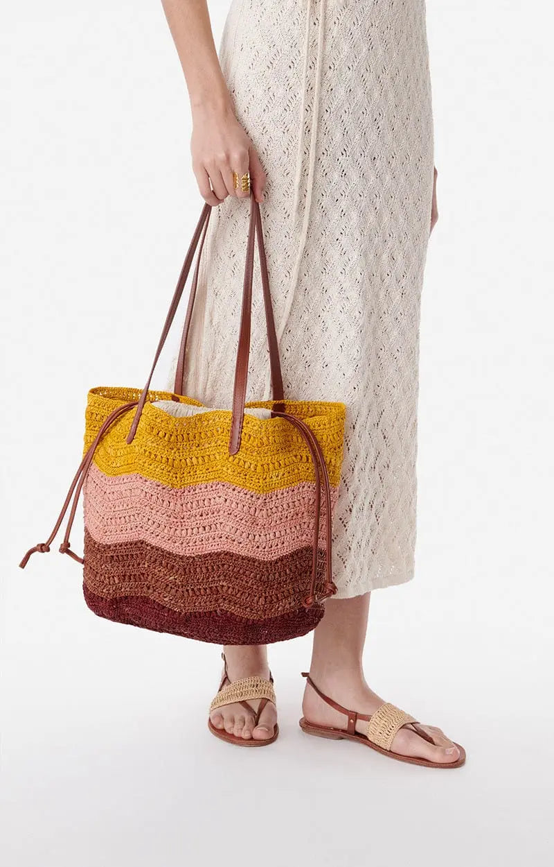 Multicolor Raffia Basket Bag with Leather Handles and Drawstring Closure